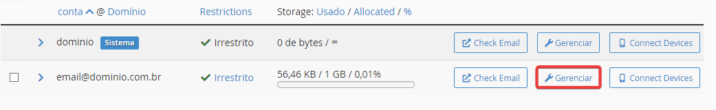No campo seguinte, localize a conta de e-mail para a qual deseja alterar o limite de espaço e clique em "Gerenciar".